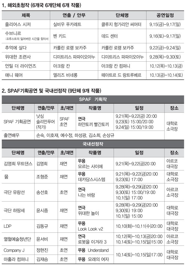 올 가을 무용과 연극을 아우르는 세계 곳곳의 매력적인 작품들이 서울 대학로에 모인다.'한국의 아비뇽 축제'로 불리는 '2017 서울국제공연예술제(Seoul Performing arts Festival. 이하 SPAF·스파프)'가 9월 15일부터 10월 15일까지 아르코예술극장과 대학로예술극장에서 펼쳐진다.올해 17회를 맞는 스파프는 지난해에 이어 한국문화예술위원회와 예술경영지원센터가 공동 주최하며 '과거에서 묻다'라는 주제 아래 그리스, 루마니아, 아일랜드, 캐나다, 프랑스, 영국 등 총 7개국의 17개 단체가 참여한다.6개국의 해외초청작과 국내 선정작 9편, 창작산실 작품 1편, 한·영 공동 프로젝트 1편, 총 17편의 작품이 공연될 예정이다. 또, 제11회 댄스컬레션&글로벌 커넥션이 같은 기간 동안 대학로예술극장 대극장과 소극장에서 개최된다.김선영 예술경영지원센터 대표는 22일 대학로예술극장 씨어터카페에서 열린 기자간담회에서 "올해는 스파프와 서울아트마켓(팸스·PAMS), 대학로를 접목해 에딘버러나 아비뇽 페스티벌처럼 세계적인 축제로 거듭날 수 있는 비전을 실천할 첫 회로 삼고자 한다"고 말했다.이병훈 스파프 연극 프로그램 감독은 "올해의 주제를 '과거에서 묻다'로 선정한 이유는 과거엔 미래를 어느 정도 예측할 수 있었는데, 지금은 앞날을 전혀 내다볼 수 없다. 이럴 때일수록 과거를 반추해 미래를 예견할 수 있을 것"이라고 밝혔다.기대작으로는 스파프와 디미트리스 파파이오아누가 공동제작한 '위대한 조련사', 즉흥 1인극 '하얀 토끼 빨간 토끼'를 비롯해 개막작 '줄리어스 시저', 평창동계올림픽 문화축제 지원작 '추억에 살다', 폐막작 '언틸 더 라이언즈', 연희단거리패의 '억척어멈과 그의 자식들', 극단 하땅세의 '위대한 놀이' 등을 꼽을 수 있다.9월 27~29일 아르코예술극장 대극장에서 아시아 초연하는 '위대한 조련사'는 2004년 아테네 올림픽 개·폐막식 총감독으로 유명한 그리스의 연출가 디미트리스 파파이오아누(52)의 신작이다. 이번 작품에서는 10명의 출연자와 함께 '인간 탐색'이라는 주제로 예술에 대한 열정을 매혹적으로 표출한다.이병훈 감독은 "순수 미술에 기본을 둔 파파이오아누의 작품은 시작적인 효과가 매우 강렬하다. 지난달 26일 막을 내린 프랑스 아비뇽 페스티벌에서 '숨막히는 아름다움'이라며 가장 호평을 받았다. 봐도 후회 없을 것"이라고 평했다.스파프는 국내외에서 이미 인정받은 작품 대신 표현 방법에서 실험적이고 신선함이 돋보이는 작품을 선정해 소개하는 특색을 지니고 있다. 스파프 기획 공연작인 '하얀 토끼 빨간 토끼'(9월 21~24일 아르코예술극장 소극장)는 대본을 보지 못한 채 무대에 오른 배우가 현장에서 받은 대본을 보며 즉흥 연기를 해야 한다.이란 작가 낫심 술리만푸어가 2010년 집필한 형식파괴극으로, 2011년 에딘버러 페스티벌과 토론토 서머워크 페스티벌에서 초연돼 아치브릭상, 우수공연 텍스트상 등을 받았다. 사전 리허설이나 연출 없이 즉석 연기로 이뤄지는 만큼 손숙, 이호재, 예수정, 하성광, 김소희, 손상규 등 6명의 연극계 대표 배우들이 출연한다.손숙 배우는 "처음 섭외를 받고 '연출 없는 연극이 있을 수 있을까' 굉장히 흥미롭다는 생각이 들었다. 공연 날짜가 다가올수록 기대가 되지만 한편으론 걱정도 된다. 오로지 배우와 관객이 만들어가는 작품이다. 관객을 믿고 끝까지 가보겠다"고 했다.이어 김소희는 "한 명의 배우가 단 하루만 공연한다. 연극 내용도 모르고 연습도 없이 무조건 무대에 오른다. 다른 배우들의 에너지나 기가 관객과 어떻게 소통하는지 보고 싶은데, 아쉽게 볼 수 없다. 하지만 6명의 배우들이 각기 다른 매력으로 관객들에게 다가가 즐거운 체험을 선사할 것"이라고 덧붙였다.이병훈 감독은 "배우들을 섭외할 때 다양한 연령층과 남녀비율을 생각했다. 무엇보다 대학로에서 연극이 주목을 받을 수 있게 기여한 배우들을 중심으로 선정했다"며 "공연의 성패는 그날 배우의 컨디션과 관객의 반응에 달렸다. 긴장감과 흥미를 동시에 갖고 있다"고 전했다.[사진=서울국제공연예술제]
