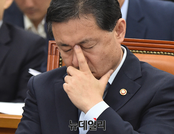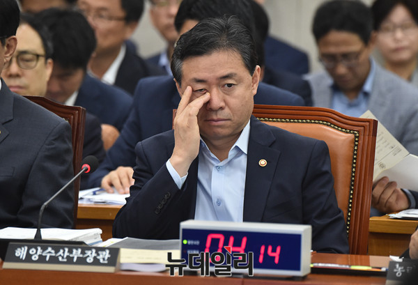 김영춘 해양수산부 장관이 22일 오전 국회 농림축산식품해양수산위원회에서 열린 전체회의에서 살충제 계란 파동으로 김영록 농림축산식품부 장관과 류영진 식품의약품안전처장에게 질문이 몰리자 눈을 감고 질문을 기다리고 있다.