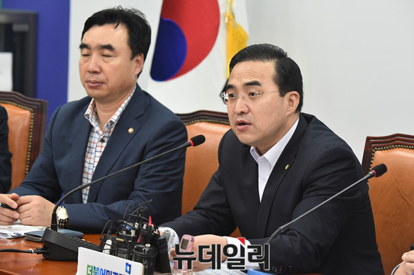 박홍근 더불어민주당 원내수석부대표가 24일 오전 국회에서 열린 정책조정회의에서 '과학기술정보방송통신위원회'가 열리지 않는 것에 대해 불만을 표시하고 있다.