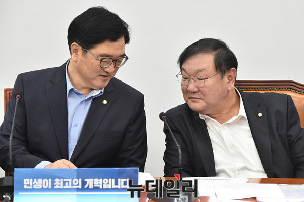 우원식 더불어민주당 원내대표가 24일 오전 국회에서 열린 정책조정회의에서 김태년 정책위 의장과 대화를 나누고 있다.
