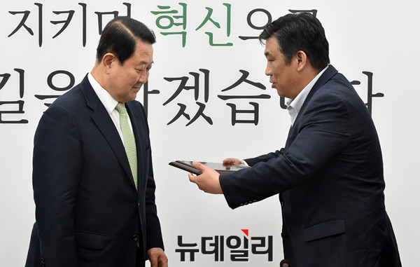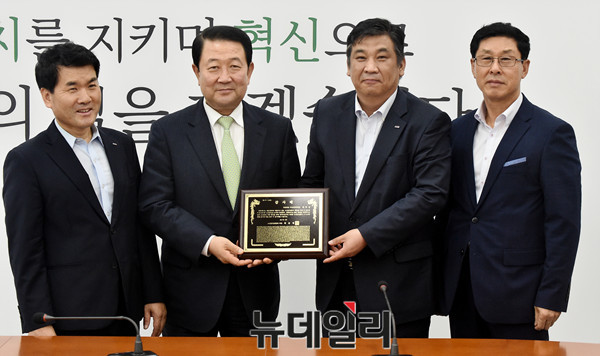 국민의당 박주선 비상대책위원장이 24일 오후 국회 당대표실에서 최승재 소상공인연합회장에게 감사패를 전달받고 있다.