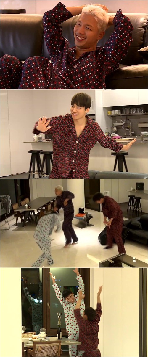 태양이 '흥부자' 빅뱅이 노는 법을 공개한다.25일 방송될 MBC '나 혼자 산다' 219회에서는 대성-승리와 만나 흥을 뿜어낸 태양의 '동할배' 일상 2탄이 전파를 탄다.이번 방송에서 태양은 대성-승리와의 파자마 파티 도중 흥이 폭주한 나머지 행사장 풍선을 연상케 하는 막춤으로 불타는 밤을 보낸다.이날 디제이는 승리로 "제일 핫한 디제이가 여기 있는데~"라는 대성의 말에 바로 노래를 틀고 막춤의 세계로 빠져들었다. 특히 태양과 대성, 승리가 무아지경으로 막춤을 추고 있는 모습이 눈길을 끈다.세 사람은 행사장 풍선에 빙의한 듯 춤으로 넘치는 흥을 방출하고 있으며, 서로 비슷한 동작으로 찰떡같은 댄스 호흡을 자랑했다. 태양은 춤에 집중한 나머지 저녁 식사로 준비 중이던 김치찜까지 태워버렸다는 후문이다.그런가 하면 대성과 승리는 와인오프너 사물모사를 하면서 흥을 이어갔다. 두 사람은 마치 만세를 하는 듯한 와인오프너의 모양을 보고 "예~"를 외치며 20대 후반답지 않은 깜찍 발랄함을 한껏 방출했다.흥부자 태양-대성-승리의 무아지경 막춤은 25일 방송되는 '나 혼자 산다'를 통해 확인할 수 있다.['나혼자산다' 태양-대성-승리, 사진=MBC]