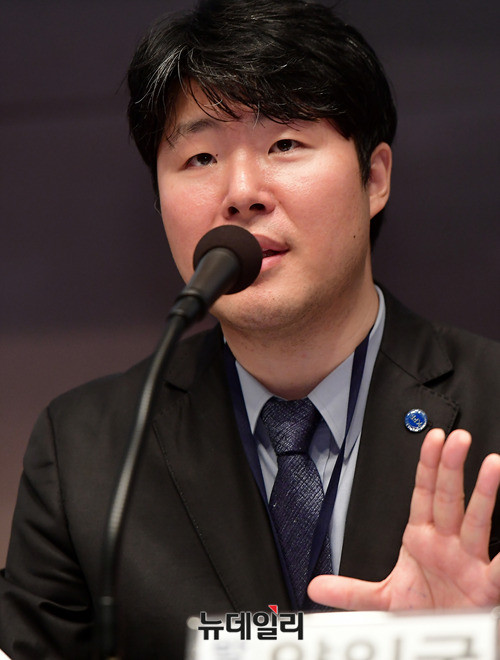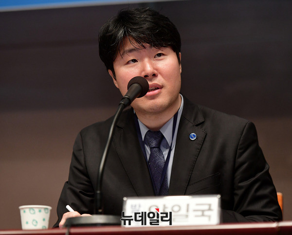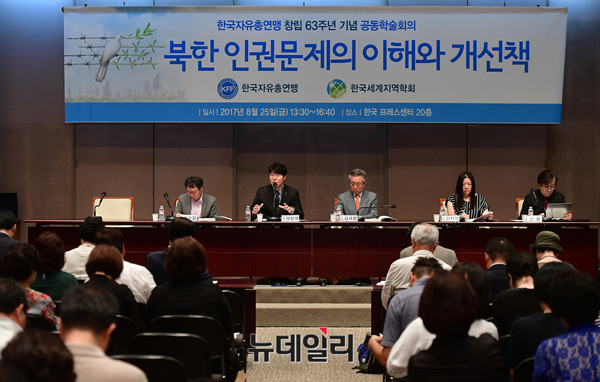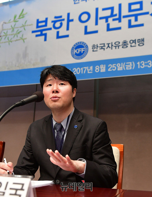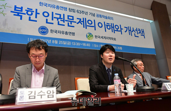 양일국 한국자유총연맹 대변인이 25일 서울 중구 한국프레스센터 국제회의장에서 열린 학술회의에서 '북한 인권문제의 정치경제적 접근'을 주제로 발제를 하고 있다.