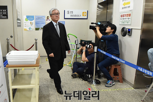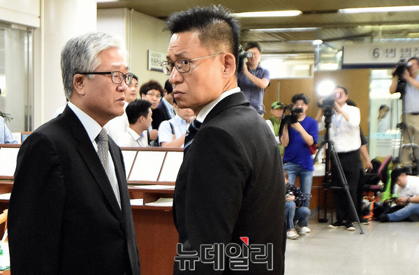 이재용 삼성전자 부회장과 함께 기소돼 재판 중인 박상진 전 삼성전자 사장과 황성수 전 전무가 25일 오후 서울 서초구 중앙지법에서 열린 뇌물 공여 등 혐의에 대한 1심 선고 공판에 출석 후 집행유예를 선고받고 법정을 빠져 나가고 있다.