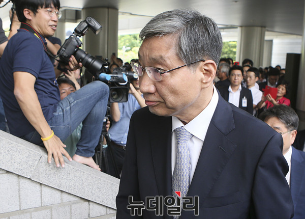 장충기 전 삼성 미래전략실 차장이 25일 오후 서울 서초동 서울중앙지법에서 열린 1심 선고공판에 출석하고 있다. (사진=공동취재단)