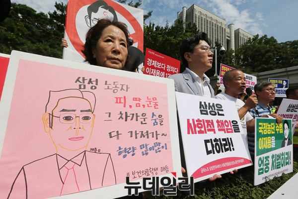 이재용 삼성전자 부회장의 선고공판일인 25일 오전 서울 서초구 서초동 서울지법 앞에서 삼성전자서비스지회, 반올림, 삼성노동인권지킴이가 이재용 부회장의 엄중 처벌을 촉구하는 기자회견을 갖고 있다.(사진=공동취재단)