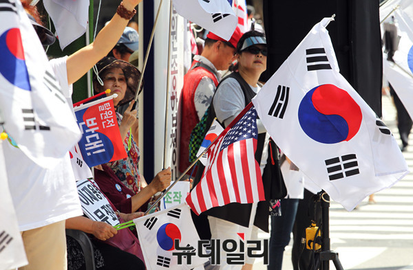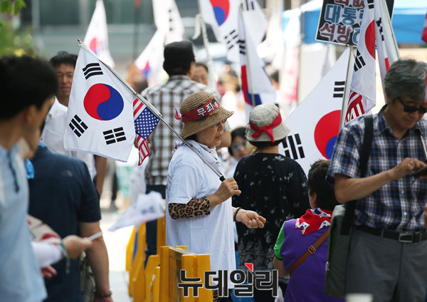 이재용 삼성전자 부회장의 선고공판이 열리는 25일 오전 서울 서초구 서초동 서울지법 앞에서 보수단체 회원들이 집회를 갖고 박근혜 전 대통령과 이재용 삼성전자 부회장의 석방을 촉구하고 있다.(사진=공동취재단)