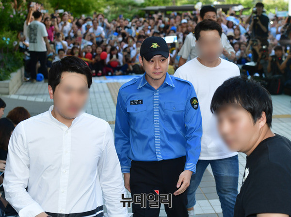 그룹 JYJ 멤버 박유천이 25일 오후 서울 강남구 강남구청에서 사회복무요원으로 대체 군복무를 마치고 소감을 밝힌 직후 차량으로 이동하고 있다. 강남구청에는 박유천의 소집해제 소식에 국내외 팬들로 붐볐다. 앞서 박유천은 지난해 6월 성폭행 혐의로 피소돼 무혐의 처분을 받은 바 있다.