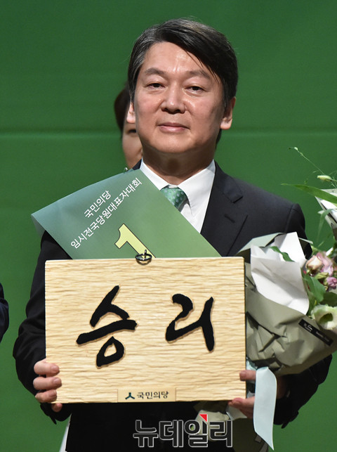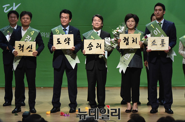 안철수 국민의당 신임 당대표 및 신임 지도부가 27일 오후 국회 의원회관 대회의실에서 열린 '임시전국당원대표자대회'에서 당선 후 혁신, 도약, 승리, 협치, 소통 이라고 적힌 명패들 들고 있다.