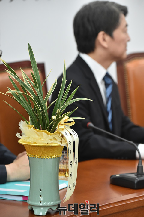 안철수 국민의당 신임 당대표가 28일 오전 국회 당대표실을 찾은 전병헌 청와대 정무수석이 들고 온 문재인 대통령의 당대표 선출 축하 화분을 전달받고 있다.