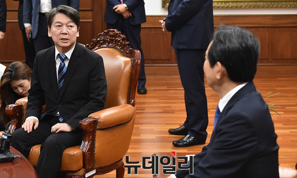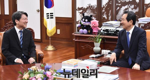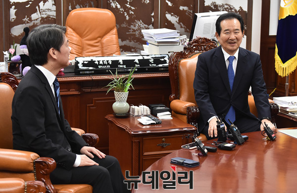 안철수 국민의당 대표가 28일 오후 국회 의장실을 찾아 정세균 의장을 예방해 환담을 나누고 있다.