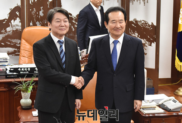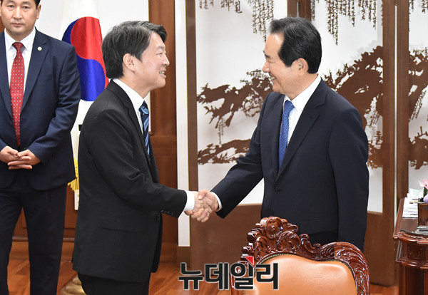안철수 국민의당 대표가 28일 오후 국회 의장실을 예방해 정세균 국회의장과 악수를 나누고 있다.