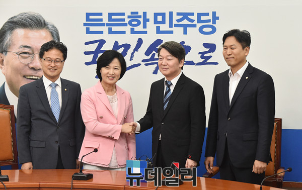 안철수 국민의당 신임 대표가 28일 오후 국회 더불어민주당 당 대표실을 찾아 추미애 대표와 악수를 나누고 있다.
