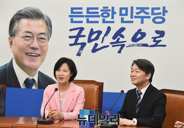 안철수 국민의당 신임 대표가 28일 오후 국회 더불어민주당 당 대표실을 찾아 추미애 대표와 대화를 나누고 있다.