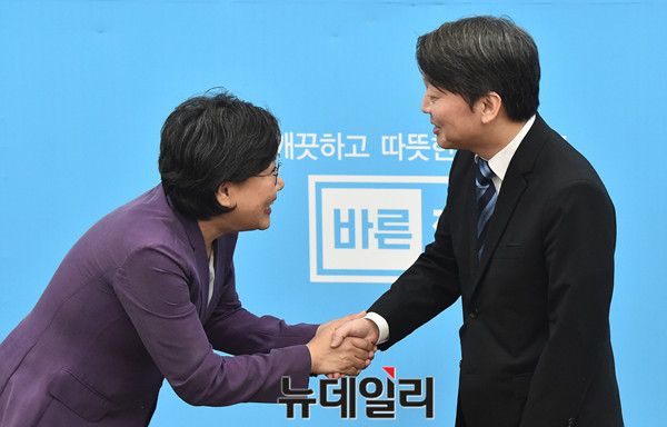 국민의당 안철수 대표가 28일 오후 국회 본청 바른정당 대표회의실을 찾아 이혜훈 대표와 인사를 나누고 있다.