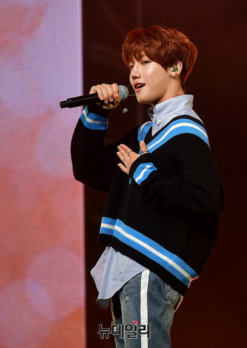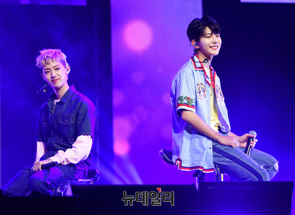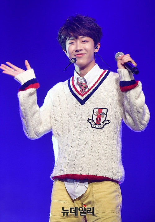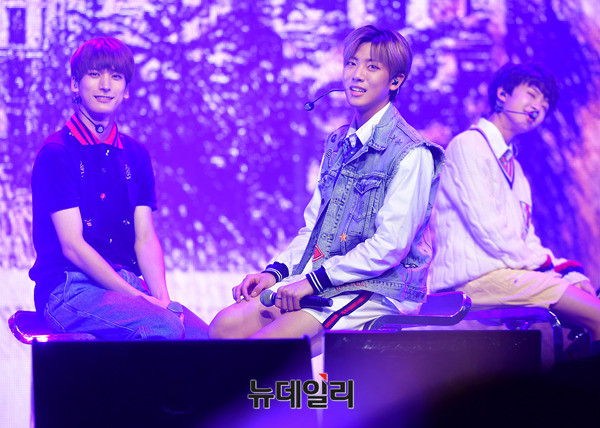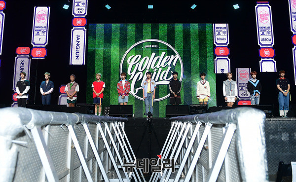 신인 보이그룹 '골든차일드(Golden Child, 장준, 동현, 보민, 재현, 지범, 주찬, TAG, 승민, Y, 재석, 대열)'가 28일 오후 서울 용산구 블루스퀘어에서 첫 번째 미니앨범 '골-차(Gol-Cha!)' 데뷔 쇼케이스를 갖고 수록곡 '네가 너무 좋아'를 열창하고 있다. 골든차일드의 타이틀곡 '담다디'는 락킹 사운드에 밝고, 청량한 느낌의 댄스곡이다. 음원은 오후 6시에 공개됐다.