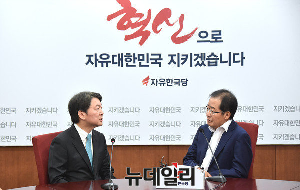 홍준표 자유한국당 대표가 29일 오전 서울 여의도 당사를 예방한 국민의당 안철수 신임 대표와 대화를 나누고 있다.