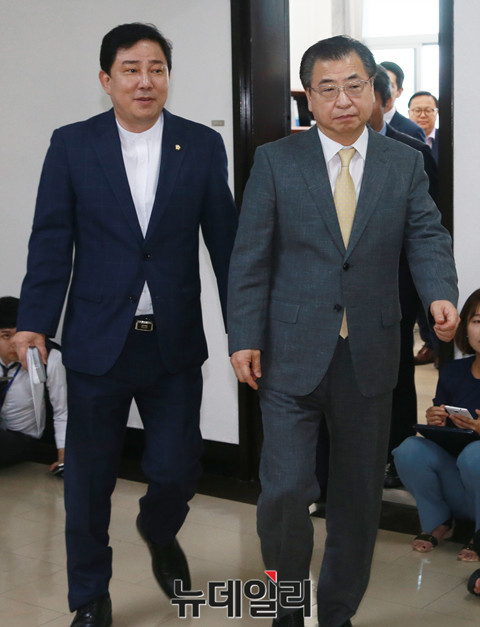 서훈 국가정보원장이 29일 오후 국회에서 열린 정보위원회 전체회의에 출석하기 위해 김병기 의원과 함께 위원장실을 나서고 있다.