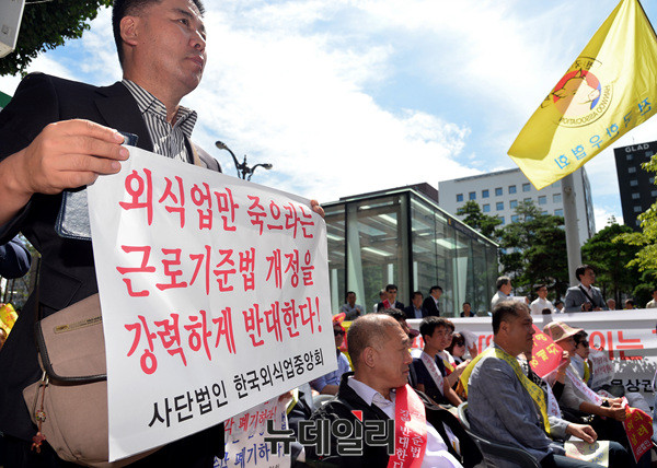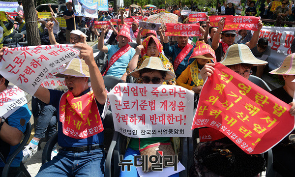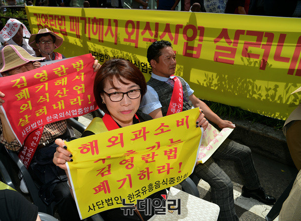한국외식중압회와 전국한우협회 등 시민단체들이 29일 오후 서울 영등포구 국민은행 서여의도영업부지점 앞에서 집회를 갖고 근로시간 단축 반대와 김영란법 폐지을 촉구했다.