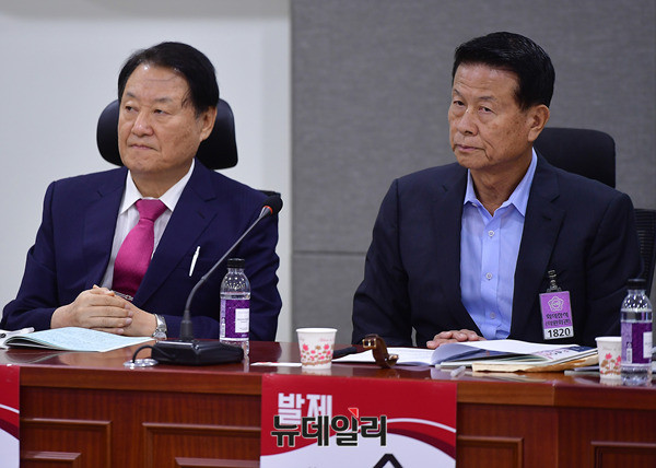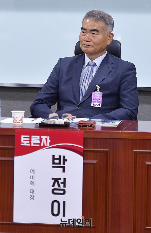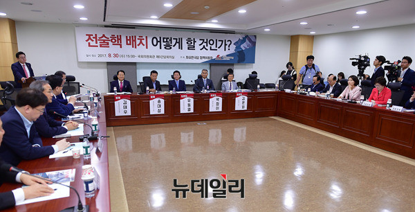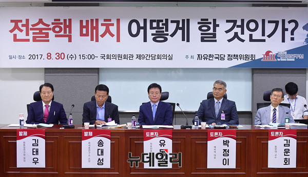김태우 전 통일연구원장, 송대성 전 세종연구소장, 유동열 자유민주연구원장, 박정이 예비역 대장, 김운회 동양대 교수(왼쪽부터)가 30일 오후 국회의원회관 제9간담회의실에서 열린 전술핵배치 토론회에 참석해 자리하고 있다.