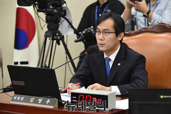 김영우 국회 국방위원장이 31일 오전 국회에서 열린 국방위 전체회의에서 북한 미사일 도발과 관련해 서주석 국방부 차관에게 질문하고 있다.