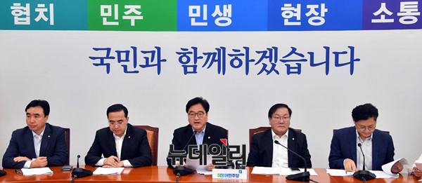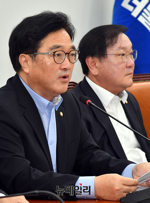 우원식 더불어민주당 원내대표가 31일 오전 국회에서 열린 정책조정회의에서 모두발언을 하고 있다.