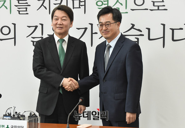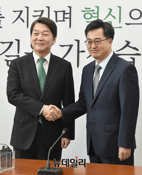 국민의당 안철수 대표가 31일 오후 국회 당 대표실을 찾은 김동연 경제 부총리 겸 기획재정부 장관과 악수를 나누고 있다.
