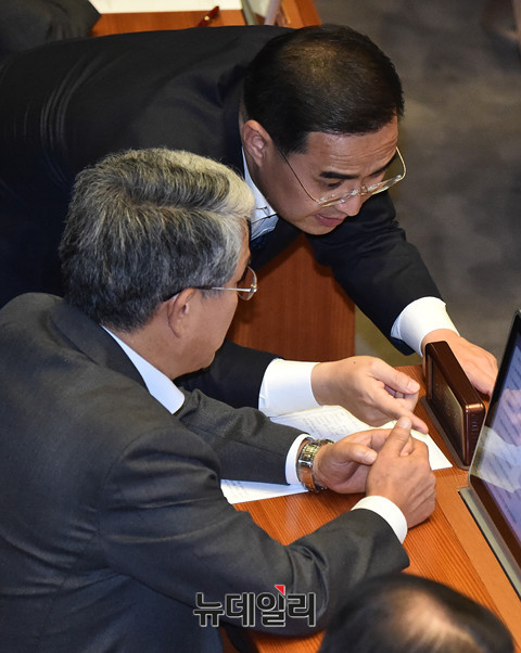 국민의당 김동철 원내대표와 더불어민주당 박홍근 원내수석부대표가 31일 오후 국회에서 열린 8월 임시국회 마지막 본회의에서 대화를 나누고 있다.