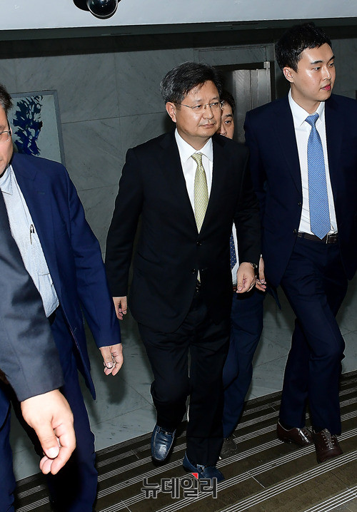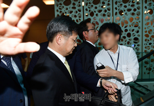 김장겸 MBC 사장이 1일 오후 서울 영등포구 63시티에서 열린 '방송 진흥 유공 포상 수여식'에 참석하기 위해 입장하고 있다. 행사장에는 MBC와 KBS 언론노조가 김장겸 사장과 고대영 사장의 퇴진을 요구하며 고성을 내기도 했다.