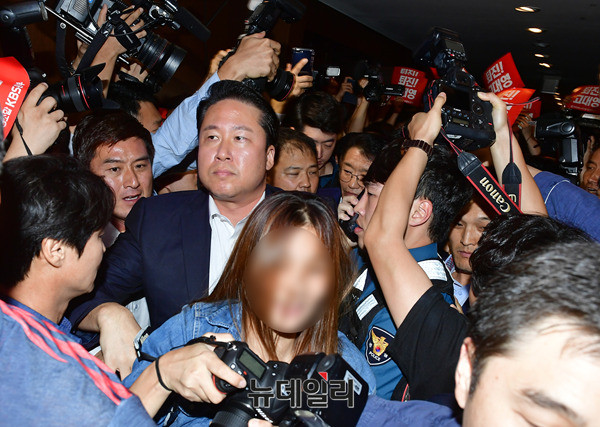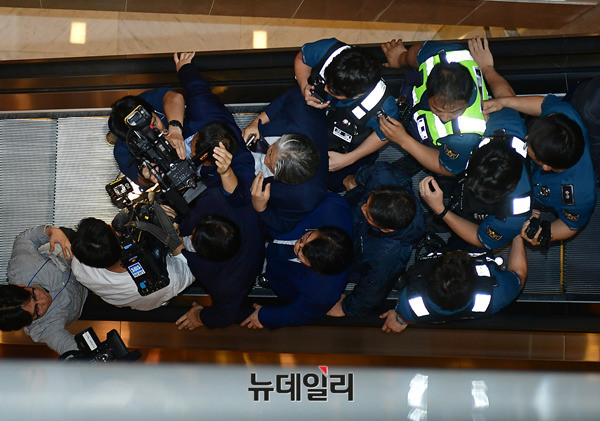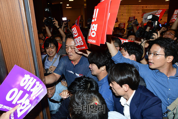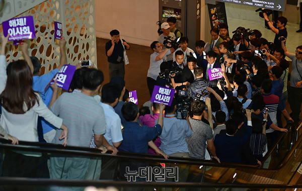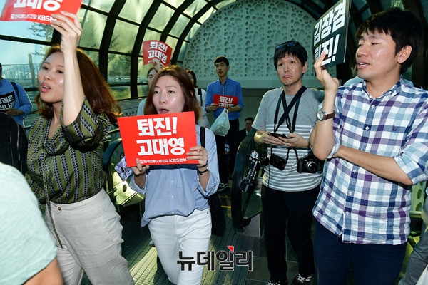 고대영 KBS사장이 1일 오후 서울 영등포구 63시티에서 열린 제54회 방송의날 축하연에 경찰의 보호를 받으며 입장하고 있다. KBS소속 언론노조들은 고 사장의 사퇴를 요구하는 손피켓을 들고 면담을 요구했다. 고 사장이 행사장으로 가기 위해 복도에 등장하자 "고대영 물러가라"를 연호하며 뒤따랐다.
