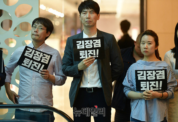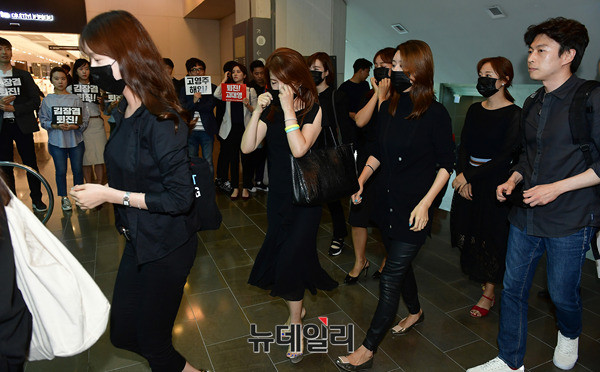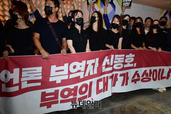 MBC 언론노조 아나운서들이 1일 오후 서울 영등포구 63시티에서 열린 '방송 진흥 유공 포상 수여식' 행사장 앞에서 검은 마스크와 검은 복장을 한 채 신동호 국장을 규탄하는 현수막을 들고 있다.