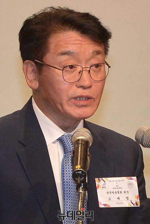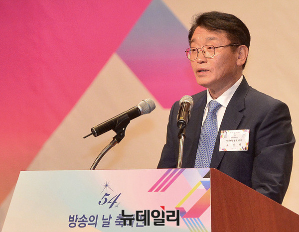 고대영 KBS 사장이 1일 오후 서울 63시티에서 열린 '방송 진흥 유공 포상 수여식' 축하연에서 축사를 하고 있다. 이날 행사장에는 MBC와 KBS 언론노조가 김장겸 사장과 고대영 사장의 퇴진을 요구하는 피켓을 들고 항의했다.