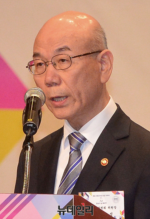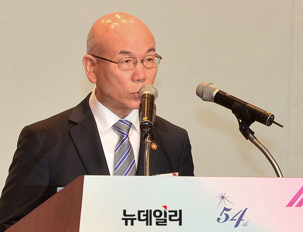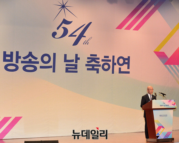 이효성 방송통신위원장이 1일 오후 서울 63시티에서 열린 '방송 진흥 유공 포상 수여식' 축하연에서 문재인 대통령의 축사를 대독하고 있다. 이날 행사장에는 MBC와 KBS 언론노조가 김장겸 사장과 고대영 사장의 퇴진을 요구하는 피켓을 들고 항의했다.
