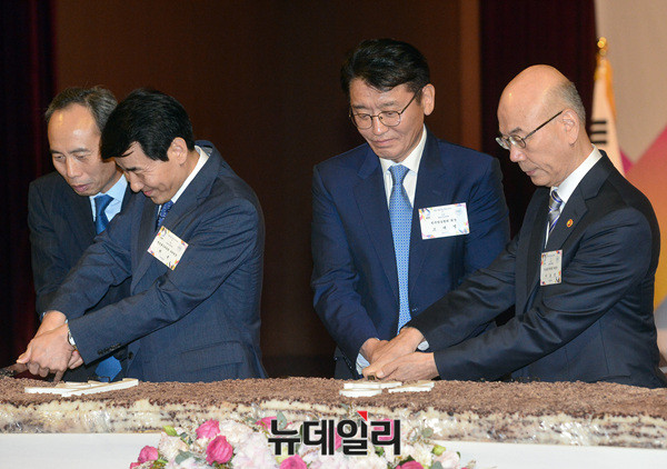 이효성 방송통신위원장과 고대영 KBS 사장이 1일 오후 서울 63시티에서 열린 '방송 진흥 유공 포상 수여식' 축하연에서 떡을 자르고 있다. 이날 행사장에는 MBC와 KBS 언론노조가 김장겸 사장과 고대영 사장의 퇴진을 요구하는 피켓을 들고 항의했다.