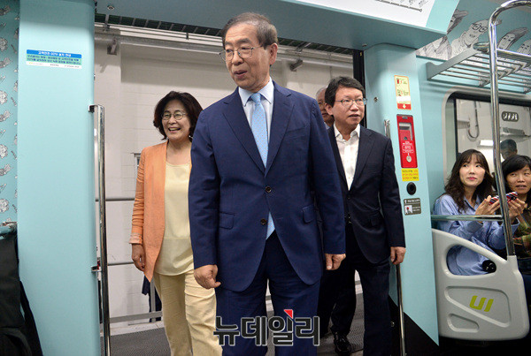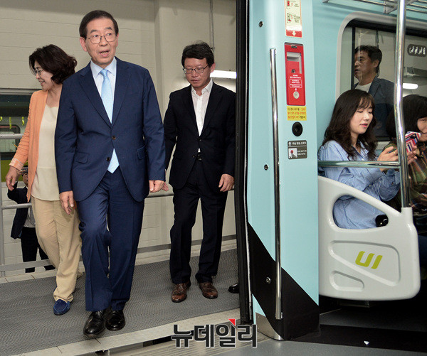 박원순 서울시장이 2일 오전 신설동역 으로 향하는 경전철에 오르고 있다. 이날 박 시장과 관계자들이 개통식 후 열차에 시승하면서 객실이 혼잡해져 일반 승객들이 불편을 겪었다.
