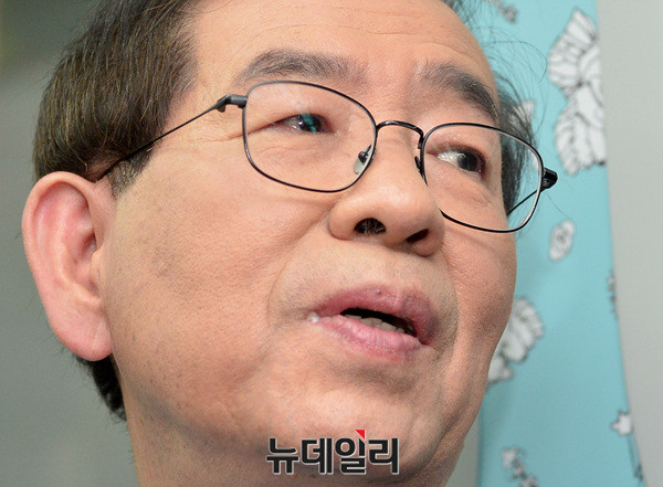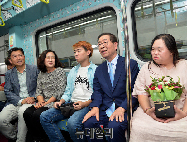 박원순 서울시장이 2일 오전 신설동역 으로 향하는 경전철에서 시민과 대화를 나누고 있다. 이날 박 시장과 관계자들이 개통식 후 열차에 시승하면서 객실이 혼잡해져 일반 승객들이 불편을 겪었다.