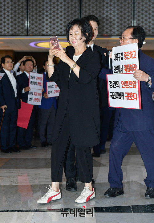 손혜원 더불어민주당 의원이 정기국회가 열린 4일 오전 국회 본회의에 입장하며 입구에서 진행된 자유한국당 의원들의 '문재인 정부 방송장악 규탄' 손피켓 시위를 휴대폰으로 실시간 방송하다 심재철 의원의 제지를 받고 있다.