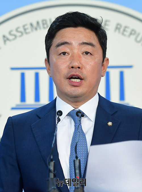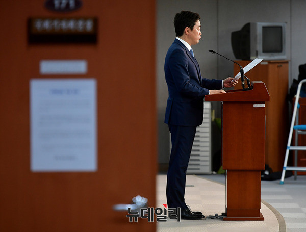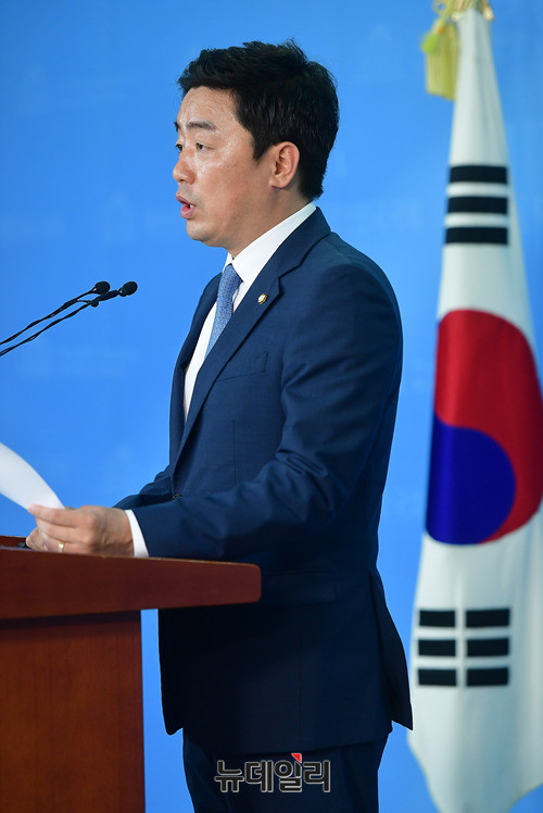 강훈식 더불어민주당 원내대변인이 4일 오후 국회 기자회견장에서 자유한국당의 국회 복귀를 촉구하는 논평을 발표하고 있다. 강 대변인은 논평을 통해 "김장겸 MBC사장이 내일 고용노동부에 자진 출석하기로 했다"며 "자유한국당도 이제 보이콧을 거두고 국회에 출석해야 한다"고 주장했다.