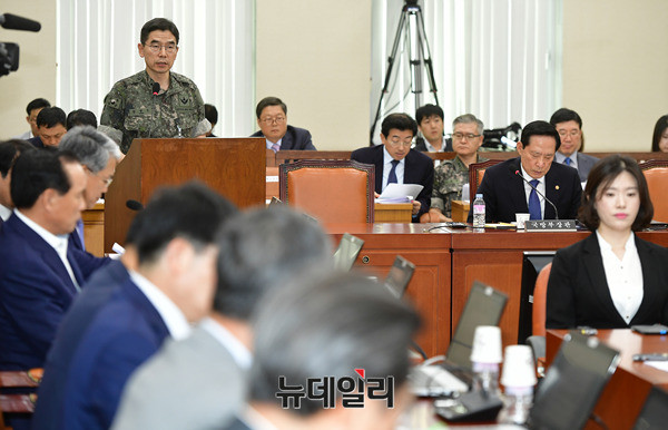 장경수 국방정책실장 직무대리가 4일 오후 국회에서 열린 국회 국방위원회 긴급 전체회의에서 국방현안에 대해 보고하고 있다.