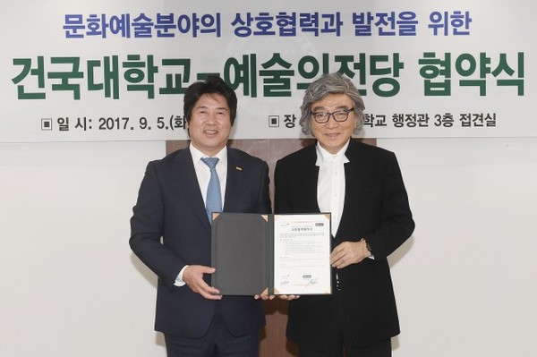 예술의전당(사장 고학찬)과 건국대학교(총장 민상기)가 문화예술분야의 상호협력과 발전을 위한 업무협약(MOU)을 체결했다.두 기관은 5일 오후 4시 서울 광진구 능동로 건국대 행정관에서 협약을 맺고, 문화예술분야에 관한 다양한 교육과정을 개발하고 운영함으로써 문화저변의 확대와 예술교육의 발전을 도모하기로 했다.예술의전당과 건국대는 문화예술행사 상호 홍보와 진행 협력 ▲문화예술분야의 교육과정 개발 및 운영 ▲문화저변 확대 및 문화소외 해소를 위한 사회공헌사업 개발 및 추진 ▲공연영상물 확산 및 공연영상화 사업 정착 협력 ▲재학생의 현장 이해를 돕기 위한 기회 발굴 협력 등을 추진할 계획이다.이날 고학찬 예술의전당 사장은 "두 기관이 보유한 역량을 바탕으로 상호 간의 긴밀한 교류와 연구를 통해 대한민국은 물론 세계를 이끄는 문화예술분야의 선두주자로 자리매김할 수 있기를 기대한다"고 말했다.1988년 설립된 예술의전당은 대한민국 최초의 복합아트센터로서 '문화예술의 창달과 진흥, 국민의 문화예술향유기회 확대'를 목표로 우수한 공연·전시 콘텐츠를 제공한다.건국대는 21세기 성장동력분야인 문화콘텐츠산업을 이끌 인재를 양성하기 위해 문과대학 내에 '문화콘텐츠학과'를 설립했다. 현재 인문학을 기반으로 영화, 애니메이션, 게임, 캐릭터, 테마파크, 문화기획 등 다양한 분야를 아우르는 융합형 교육을 실시하고 있다.[사진=예술의전당]
