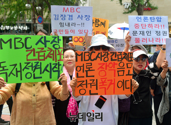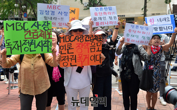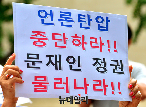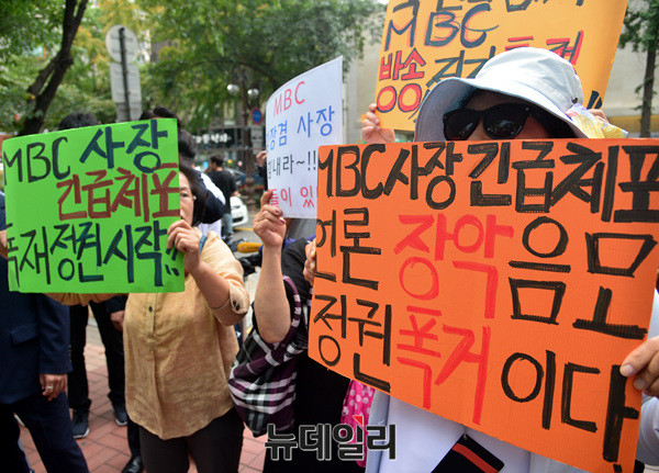 엄마부대 회원들이 5일 오전 고용노동부 서울서부고용노동지청에 앞에서 김장겸 MBC 사장의 출석 중 '언론탄압 중단하라! 문재인 정권 물러나라!'고 적힌 피켓을 들고 있다.