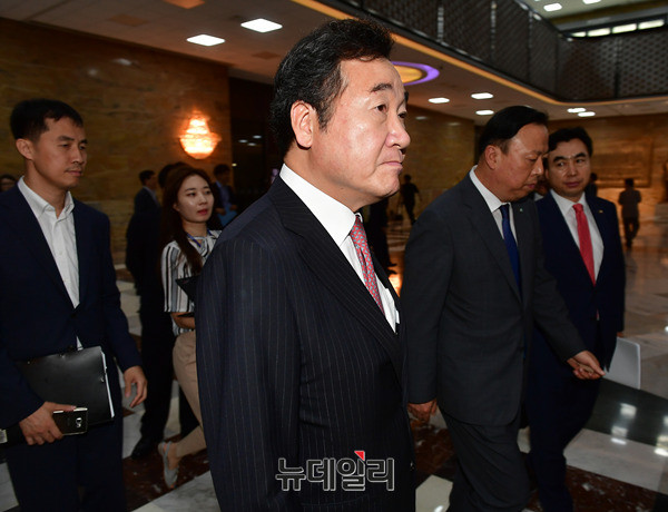 이낙연 국무총리가 5일 오전 국회 본회의장에서 열린 정기국회가 무산 되자 국회를 나서고 있다. 자유한국당은 문재인 정부의 공영방송 장악시도에 반발해 국회 보이콧을 진행중이다.