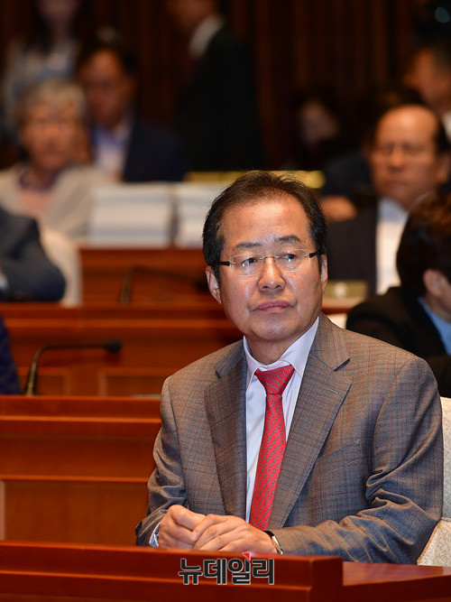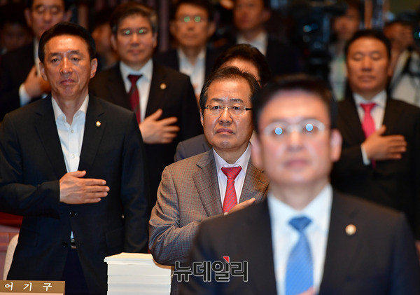홍준표 자유한국당 대표가 5일 오전 국회에서 열린 비상의원총회에 입장 도중 국민의례를 하고 있다. 자유한국당은 문재인 정부의 공영방송 장악시도에 반발해 국회 보이콧을 진행중이다.