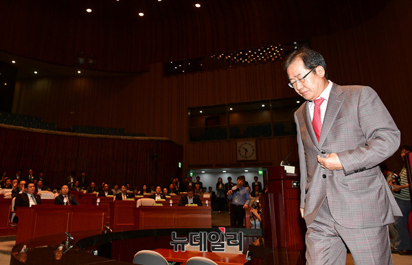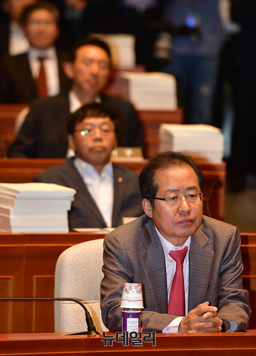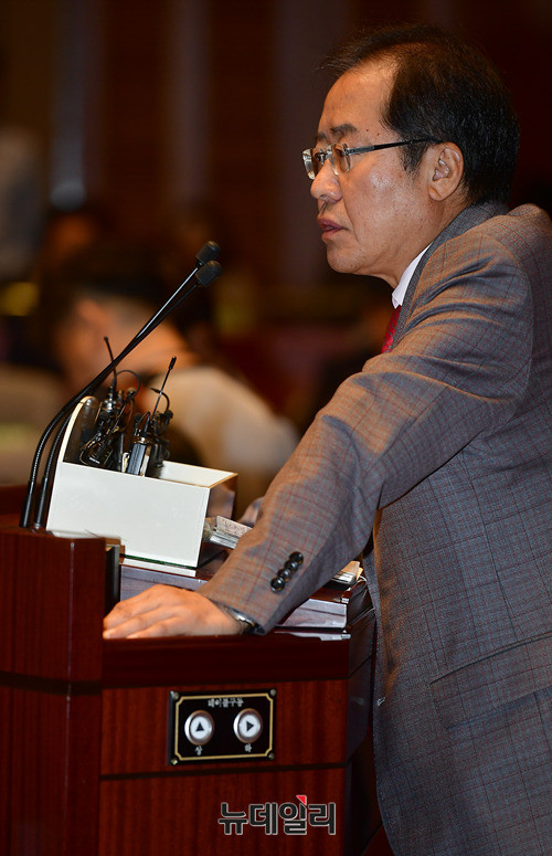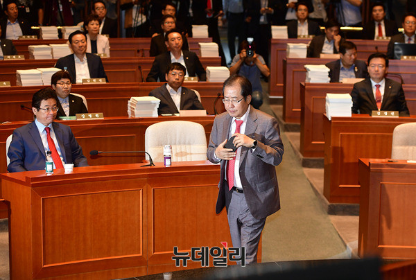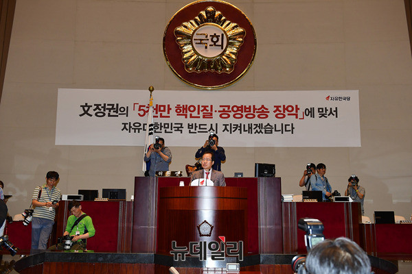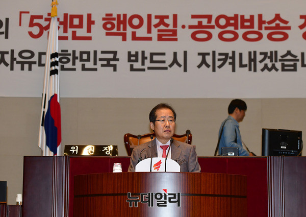 홍준표 자유한국당 대표가 5일 오전 국회에서 열린 비상의원총회에서 발언하고 있다. 자유한국당은 문재인 정부의 공영방송 장악시도에 반발해 국회 보이콧을 진행중이다.
