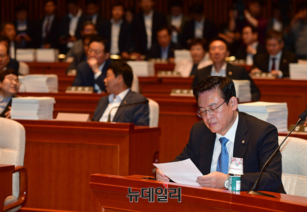 정우택 자유한국당 원내대표가 5일 오전 국회에서 열린 비상의원총회에서 모두발언을 하고 있다. 자유한국당은 문재인 정부의 공영방송 장악시도에 반발해 국회 보이콧을 진행중이다.