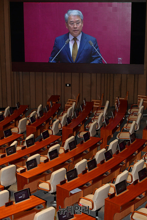 김동철 국민의당 원내대표가 6일 오전 국회 본회의장에서 교섭단체 대표연설을 하고 있다. 자유한국당은 본회의에 불참하고, 같은 시각 비상의총을 진행했다.