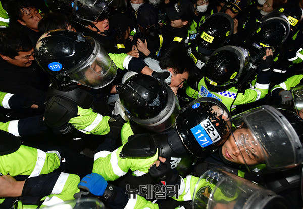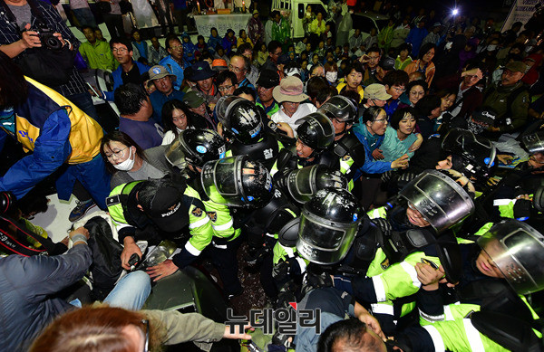 • 사드 발사대 4기가 추가 배치되는 8일 새벽 경북 성주군 소성리 마을회관 앞에는 사드반대 집회 참가자들과 경찰이 대치하고 있다. 사드배치 반대자들은 성주기지로 향하는 도로를 차와 인간띠를 두른채 막고 있다. 경찰은 견인차와 병력으로 이들을 강제 해산하고 있다. 오산기지를 출발한 사드발사대 수송트럭은 이날 오전 6시 30분께 성주기지로 진입할 것으로 보인다. (경북 성주=뉴데일리 정상윤 기자)