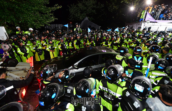 사드 발사대 4기가 추가 배치되는 8일 새벽 경북 성주군 소성리 마을회관 앞에서 사드발사대 수송트럭을 막기 위해 도로점거한 한 차량이 견인되고 있다. 사드배치 반대자들은 성주기지로 향하는 도로를 차와 인간띠를 두른채 막고 있다. 경찰은 견인차와 병력으로 이들을 강제 해산하고 있다. 오산기지를 출발한 사드발사대 수송트럭은 이날 오전 6시 30분께 성주기지로 진입할 것으로 보인다. (경북 성주=뉴데일리 정상윤 기자)
