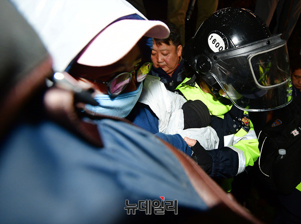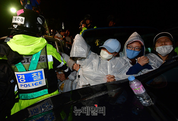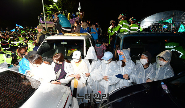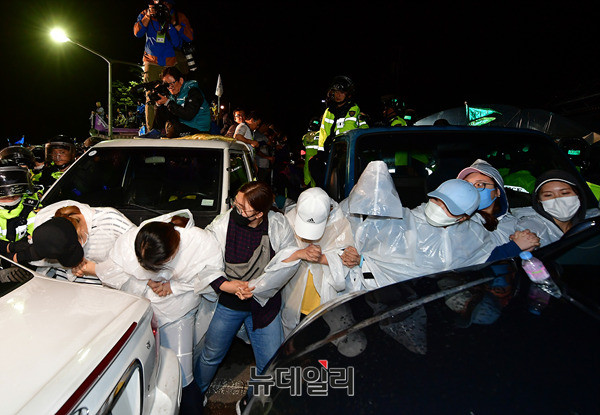 사드반대 집회 참가 대학생들이 8일 새벽 경북 성주군 소성리 마을회관 앞에서 도로 점거한 차량사이에서 팔을 이어 경찰의 해산에 버티고 있다. 사드 발사대 4기가 추가 배치된다는 소식 전부터 성주기지 앞에는 반대자들과 경찰이 대치했다. 오산기지를 출발한 사드발사대 수송트럭은 이날 오전 6시 30분께 도착할 예정이지만 날이 밝은 아침까지 대치는 계속되고 있다. (경북 성주=뉴데일리 정상윤 기자)
