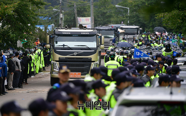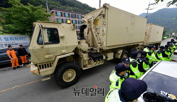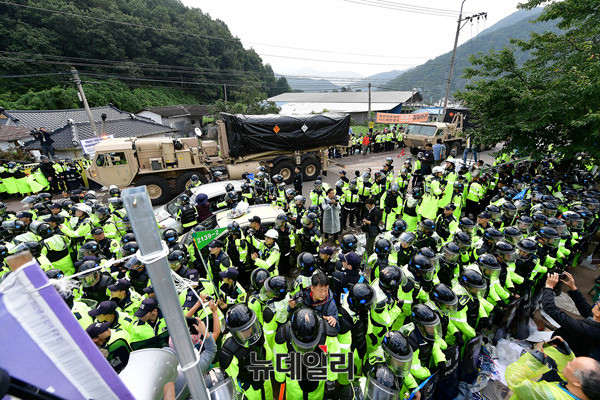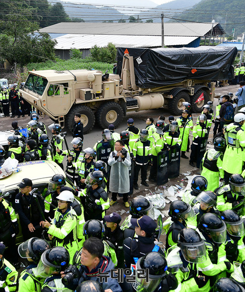 사드 발사대가 7일 오전 8시 10분께 경북 성주군 소성리 마을회관 앞을 지나고 있다. 사드배치 반대자들은 경찰과 대치하며 개인차량으로 도로 점거를 하고, 인간띠를 묶어 도로를 점거하며 철야 대치했다.